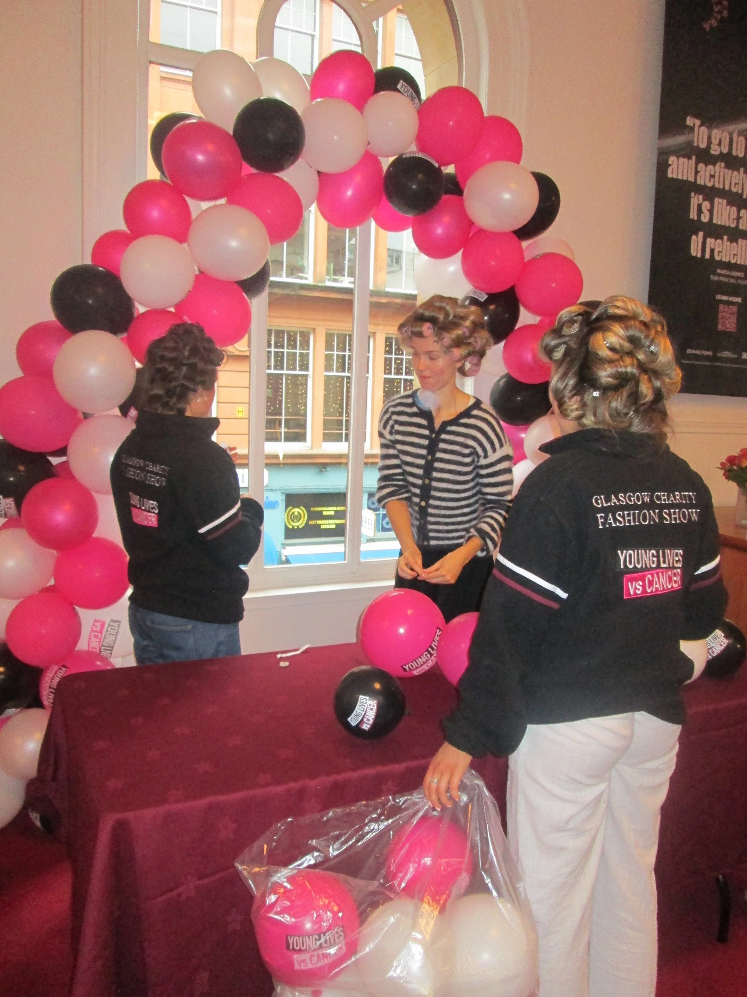 We arrived nice and early to resume the show prep we started on Friday. From final sponsorship content to venue decor, all hands were on deck to turn the Old Fruitmarket into a proper Glasgow party! With pin-curls in their hair and GCFS fleeces to keep them warm, the charity team created this stunning Young Lives vs. Cancer balloon arch!